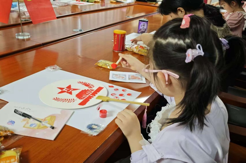 活動現(xiàn)場,公司黨員志愿者向孩子們發(fā)放了印有國旗、黨徽、“童心向黨”“不忘初心”等元素的拓印模板、空白扇子及顏料等材料,并圍繞紅色符號展開講解,讓大家理解每個圖案背后的歷史意義和精神內涵。隨后志愿者們示范拓印方法,孩子們專注投入,有的仔細調整圖案位置,有的認真拓上紅色顏料,現(xiàn)場氛圍熱烈且充滿活力。